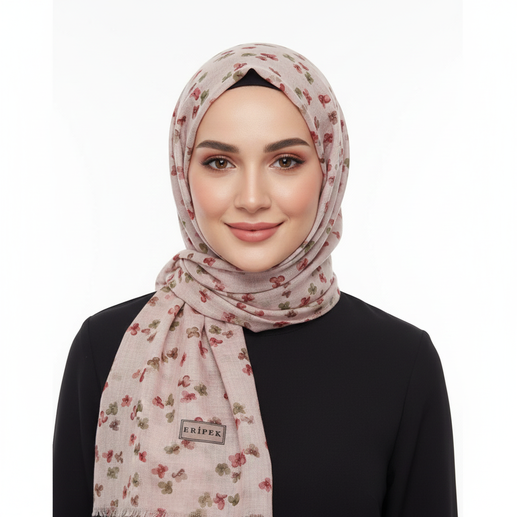 Eripek saçaklı pamuk tülbent, doğal pamuk dokusu sayesinde gün boyu hafiflik ve nefes alabilirlik sunar. Yumuşak yapısı cildi tahriş etmez, ferah kullanımıyla dört mevsim tercih edilebilir. Kenarlarında yer alan zarif saçak detayları, tülbente doğal ve şık bir görünüm kazandırır.